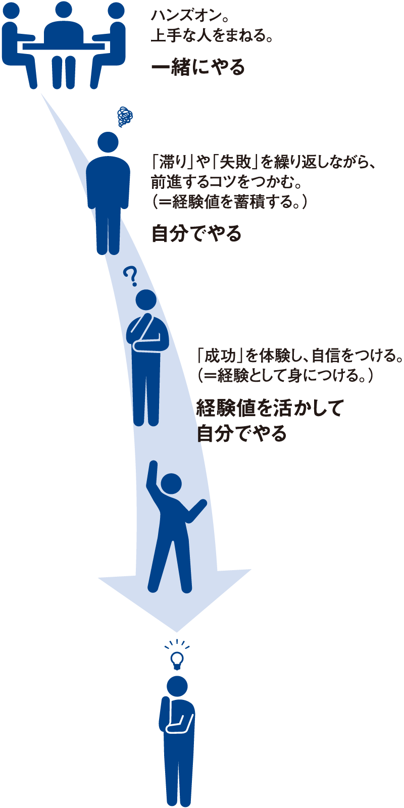 さらに、各個人の性格に応じたカリキュラムによって知識・スキルを積み上げ、実際の業務を体験することで失敗を繰り返しながら、ポイントを習得する思考や行動を身につけていきます。