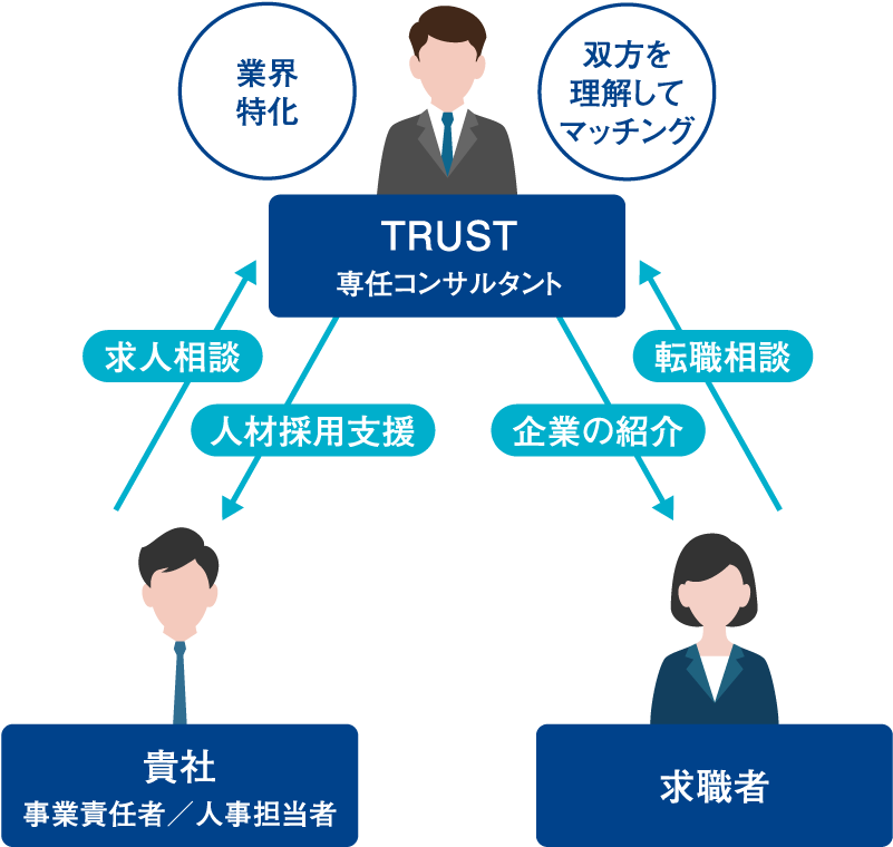 当社の人財紹介サービスでは法人/転職希望者の双方を、専任のコンサルタントが担当します。
